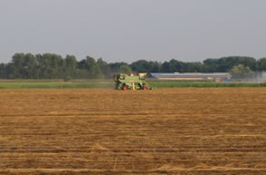 Oogst Vanaf begin juli, als de weersomstandigheden het toelaten, wordt er begonnen met de pluk van het vlas. De vlasplant wordt met wortel en al uit de grond getrokken. Het vlas wordt parallel op de grond gelegd in zwaden. |
